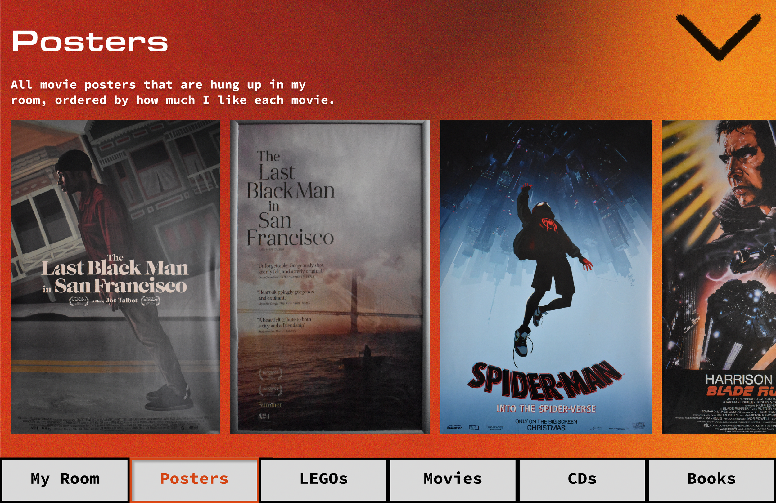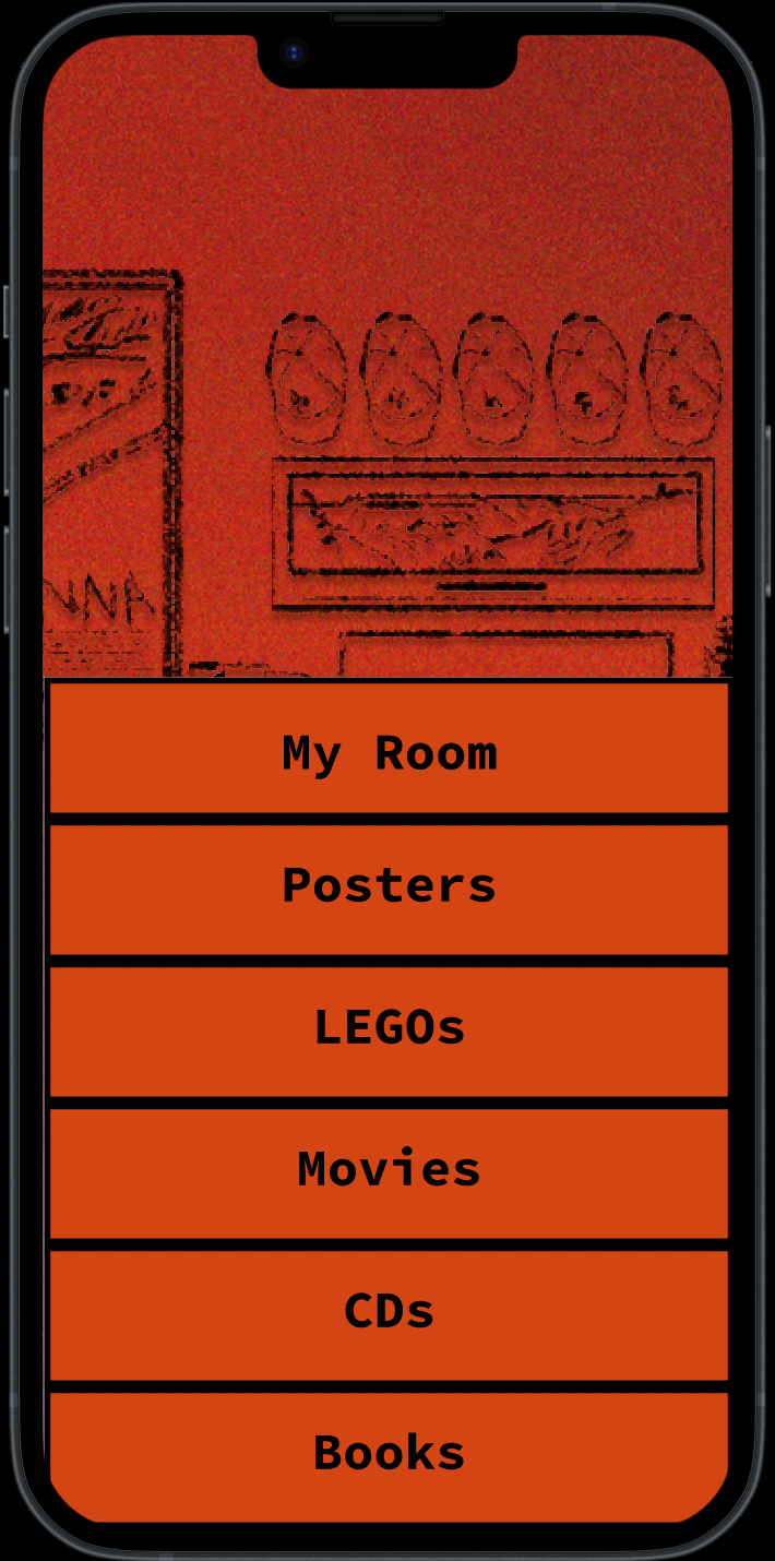 Everything can be clicked on within the room. The navigation bar at the bottom allows the user to find related items, like my posters, LEGOs, DVDs, CDs, and books.