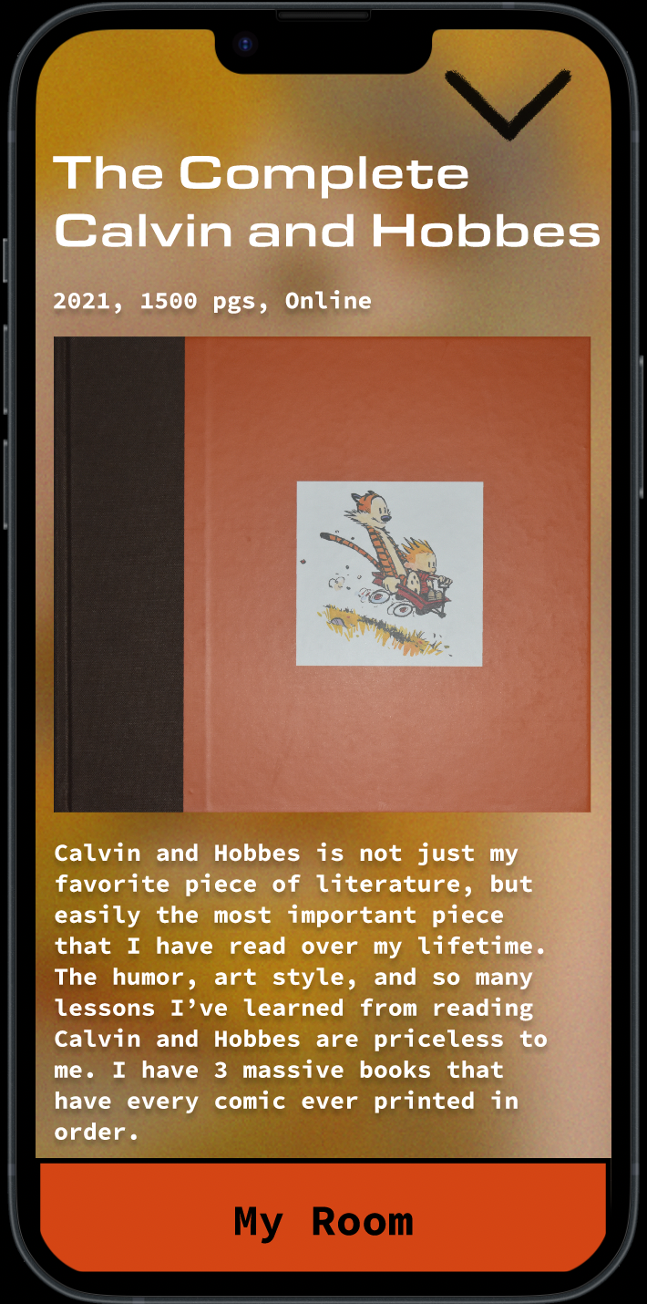 Just about every item is accounted for and clickable. Each item was hand drawn and then brought into the prototype. The website serves almost as an archive of my current possessions and interests. Each item has its own page which includes a brief description, a photo of the item, and when and how I acquired it.